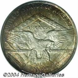 <table><tr><td><table><tr><td>1936-D 50C Arkansas MS67 PCGS. While the Arkansas Commemorative Halves are not one of the better known condition rarities in the series, specialists who have searched for a Superb example certainly have respect for this issue. The surfaces on this piece are virtually unmarked and each side shows rich, multicolored patina with deeper toning around the margins. A must-see coin for the serious commemorative collector. Population: 15 in 67, 0 finer (2/04). <BR><BR><B>Important notice:</B> Heritage usually auctions material at the rate of 200-250 lots per hour. On some occasions eBay Live bid software or the Internet may not be able to keep up with the pace of the auction. We recommend placing a realistic absentee bid now as insurance to avoid disappointment. Occasionally the auctioneer may eliminate or reject an eBay Live bid, and the auctioneer may also reopen a lot after the close of the eBay live bidding (usually because we missed an audience bid), and may reject your bid even if it shows you as the winning bidder. By bidding via eBay Live, you agree that Heritage may award the lot to another bidder at its sole discretion under the circumstances described above or any other reasonable circumstances. Since eBay bids are not shown to us until we open the lot on the floor, we treat those bids just like floor bids. In most cases the floor responds before the eBay bid is presented to us, due to Internet lag time, so for consistency we have made it a policy that floor bids are always considered first over tie eBay live bids. Also please note that all Heritage lots purchased through eBay Live carry a 20% Buyer's Premium. Please make sure you read the Terms and Conditions before you bid. <BR><BR><B>IMPORTANT ANNOUNCEMENT ABOUT RESERVES:</B> Heritage now divulges all reserves on its web site 7 days before every auction. If you want to know whether the reserve on this lot has been met, and if not, what the reserve amount is, please visit this lot page on the HeritageCoin.com web site, or email: bid@HeritageGalleries.com </span></font></td></tr></table></td></tr></table>