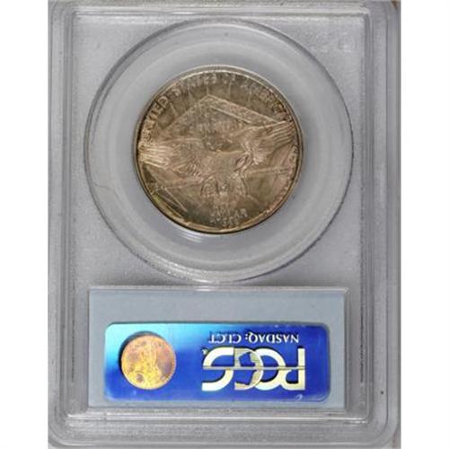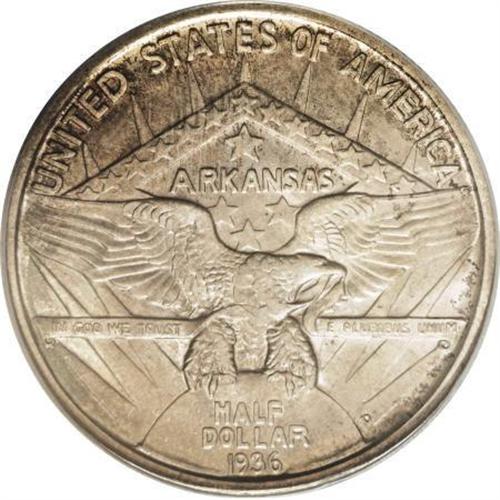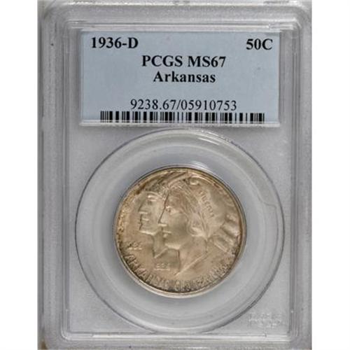 <B>1936-D 50C Arkansas MS67 PCGS.</B></I> A Superb Gem specimen with highly lustrous surfaces beneath pale heather and iridescent toning. This piece is tied for the finest certified by PCGS, and it survives from a mintage of less than 10,000 coins. Population: 18 in 67, 0 finer (8/07).<BR><BR><b>Shipping:</b> Coins & Currency (<a target="_blank" href="http://www.heritageauctions.com/common/shipping.php">view shipping information</a>)