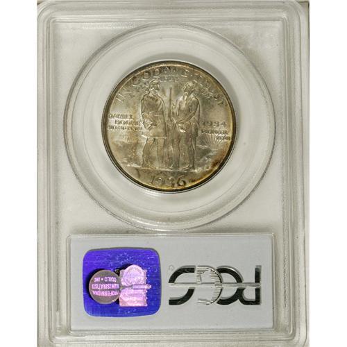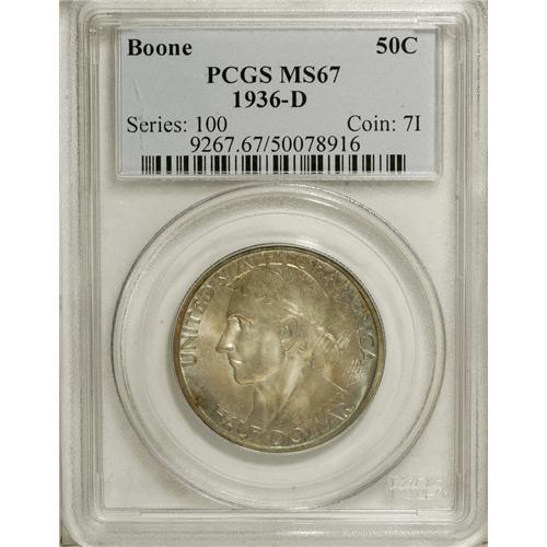 <B>1936-D 50C Boone MS67 PCGS.</B></I> This Superb Gem displays mixed russet and blue patina on the obverse, while the reverse is a blend of russet, green, and magenta patina. Sharply struck with velvety luster. The mintage of 5,005 pieces reflects the last year that so many three-coin Boone sets would sell. Population: 21 in 67, 0 finer (3/07).<BR><I>From The Cary & Cheryl Porter Collection.</B></I><BR><BR><b>Shipping:</b> Coins & Currency (<a target="_blank" href="http://www.heritageauctions.com/common/shipping.php">view shipping information</a>)