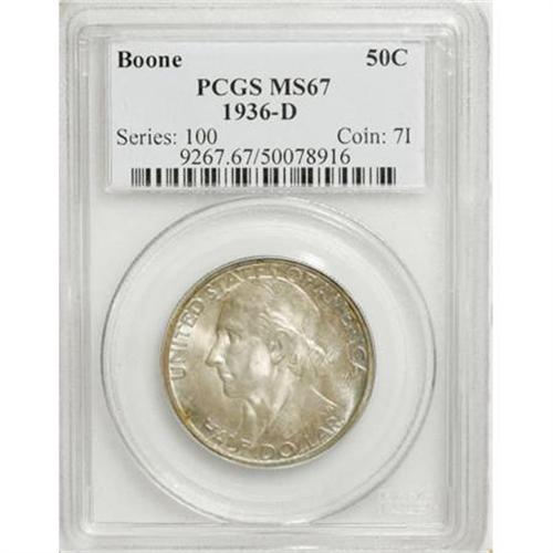 <B>1936-D 50C Boone MS67 PCGS.</B></I> This Superb Gem displays mixed russet and blue patina on the obverse, while the reverse is a blend of russet, green, and magenta patina. Sharply struck with velvety luster. Neither NGC nor PCGS has graded a numerically finer piece (10/07).<BR><BR><b>Shipping:</b> Coins & Currency (<a target="_blank" href="http://www.heritageauctions.com/common/shipping.php">view shipping information</a>)