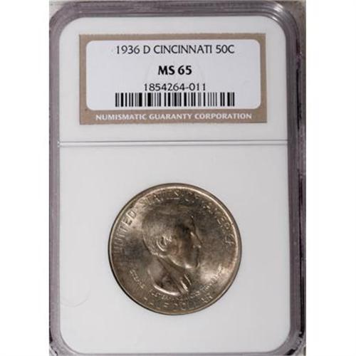 <B>1936-D 50C Cincinnati MS65 NGC.</B></I> NGC Census: (465/225). PCGS Population (538/295). Mintage: 5,005. Numismedia Wsl. Price for NGC/PCGS coin in MS65: $585. (#9284)<BR><I>From The Frank DuVall Collection of U.S. Commemoratives.</B></I><BR><BR><b>Shipping:</b> Coins & Currency (<a target="_blank" href="http://www.heritageauctions.com/common/shipping.php">view shipping information</a>\)