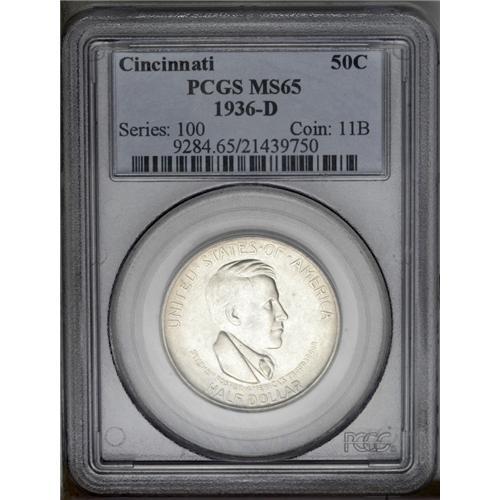 <B>1936-D 50C Cincinnati MS65 PCGS.</B></I> A lustrous and very attractive example of this Denver Mint, Cincinnati Commemorative issue with a bright, essentially untoned appearance. Only 5,005 pieces were struck.