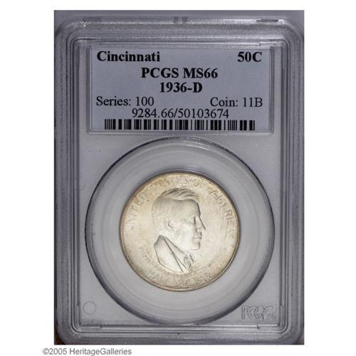 <B>1936-D<50C> Cincinnati MS66 PCGS.</B></I> A lustrous apricot-tinged premium Gem, nicely struck and void of noticeable contact throughout the fields. The Cincinnati is a difficult type, the combined mintage of 15,000 pieces also subject to strong demand from date and mint collectors who seek the complete PDS set.