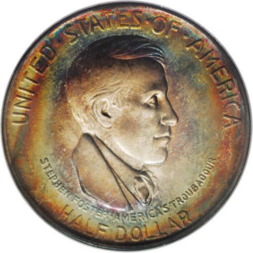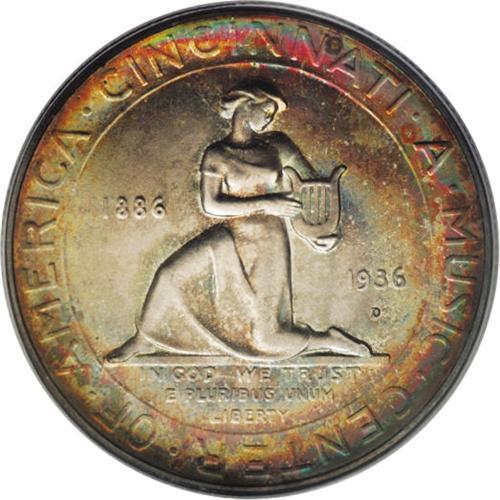 <B>1936-D 50C Cincinnati MS66 PCGS.</B></I> Even though the Cincinnati issues rank among the most exploitative of the classic commemoratives, the situation could have been worse; in numismatic distributor Thomas G. Melish's original plan, the 1936-D would have had a mintage of just 2,000 pieces! As it is, only 5,005 examples of this issue left the Mint. Swirls of ruby, gold, cyan, magenta, and periwinkle-blue grace the immensely lustrous surfaces of this captivating coin. A delectable example for the toning enthusiast.<BR><I>From The Cary & Cheryl Porter Collection.</B></I><BR><BR><b>Shipping:</b> Coins & Currency (<a target="_blank" href="http://www.heritageauctions.com/common/shipping.php">view shipping information</a>)