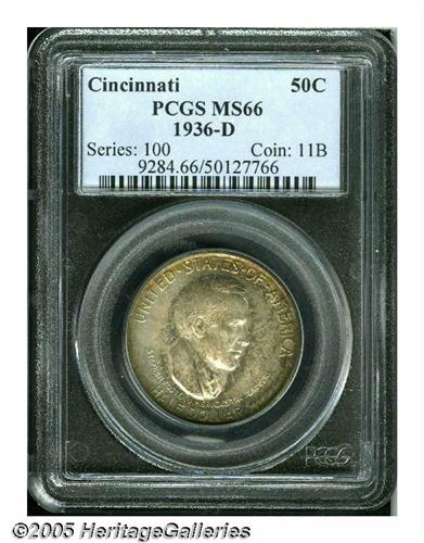 <B>1936-D<50C> Cincinnati MS66 PCGS.</B></I> Gorgeous golden-brown, navy-blue, and dove-gray colors endow this lustrous premium Gem. A solitary mark above the 1886 denies perfection. Well struck for the type, which often shows weakness on the knee of the harpist. One of the most notorious Commemorative types of its day, the low mintage Cincinnati PDS Set sold out upon issue and has since been regarded as one of the keys to the series.
