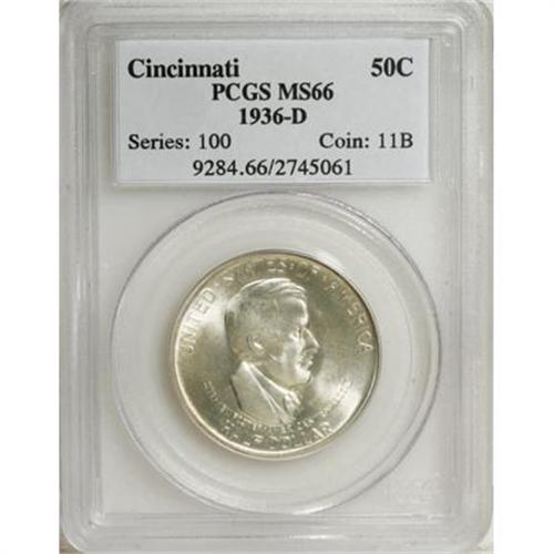 <B>1936-D 50C Cincinnati MS66 PCGS.</B></I> The Cincinnati half dollars' exploitative marketing made the issues infamous in American numismatics. This is a strongly lustrous example of the Denver version, pleasingly detailed with only the faintest hints of golden toning near the margins. PCGS has graded only 28 finer pieces (9/07).<BR><I>From The Sterling Collection.</B></I><BR><BR><b>Shipping:</b> Coins & Currency (<a target="_blank" href="http://www.heritageauctions.com/common/shipping.php">view shipping information</a>)