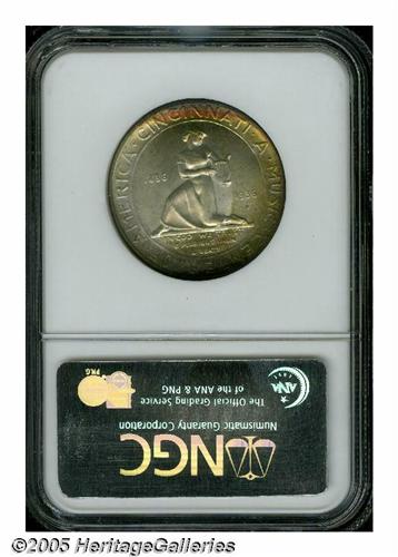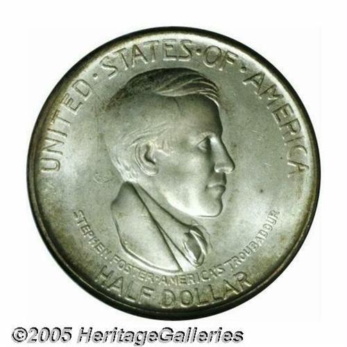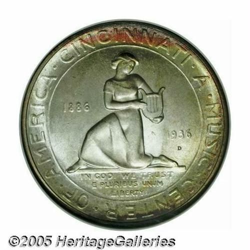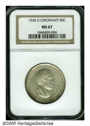 <B>1936-D<50C> Cincinnati MS67 NGC.</B></I> The Cincinnati Musical Center Commemorative actually did more to celebrate the extensive contribution of the area to music than commemorate some particular event that happened 50 years prior in 1886. The obverse portrait of Stephen Foster is idealized, while the reverse sports the personification of music in the form of a woman playing the lyre. These were issued right at the peak of commemorative craze that swept collectors of the 1930s, and most were not very carefully saved in their original paper holders. In fact, almost none are found in the upper Gem grades as seen here. This is certainly a memorable example of this issue, with a bold strike and ample mint luster, and lovely, light original toning. One of the very finest to survive for collectors today. If you demand a top-notch coin, and have the means, then why not add this pristine condition rarity to your collection today? Population: 17 in 67, 1 finer (4/05).