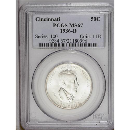 <B>1936-D<50C> Cincinnati MS67 PCGS.</B></I> Colorless and exceptionally well struck. Even close examination fails to reveal any mentionable contact marks or other blemishes visible on the fragile, unprotected fields. A conditionally rare item in this superlative grade. Population: 24 in 67, 1 finer (1/06).