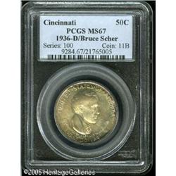 <B>1936-D 50C Cincinnati MS67 PCGS.</B></I> The Cincinnati Musical Center Commemorative actually did more to celebrate the extensive contribution of the area to music than commemorate some particular event that happened 50 years prior in 1886. The obverse displays a portrait of Stephen Foster, while the reverse sports the personification of music in the form of a woman playing the lyre. These were issued right at the peak of commemorative craze that swept collectors of the 1930s, and most were not very carefully saved in their original paper holders. In fact, almost none are found in the upper Gem grades as seen here. This is certainly a memorable example of this issue, with a bold strike and outstanding mint luster. A lovely mix of low intensity golden-brown, powder-blue, and magenta patina occupies each side. This is one of the very finest to survive for collectors today. Population: 24 in 67, 1 finer (1/05).<BR><I>From the Bruce Scher #1 All-Time PCGS Registry Set.</B></I> Lot:4149