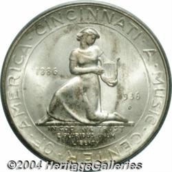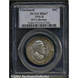 <B>1936-D<50C> Cincinnati MS67 PCGS.</B></I> Fully struck with pristine surfaces, overlaid in specks of russet, crimson, apricot, and indigo-green toning on the obverse, and a few small splashes of pastel color on the reverse. An extremely well preserved and aesthetically pleasing example of this low-mintage commemorative issue. Population: 21 in 67, 1 finer (6/04).<BR><I>From the JFS Collection, the #1 All-Time PCGS Registry Set.</B></I> <BR><BR><B>Important notice:</B> Heritage usually auctions material at the rate of 200-250 lots per hour. On some occasions eBay Live bid software or the Internet may not be able to keep up with the pace of the auction. We recommend placing a realistic absentee bid now as insurance to avoid disappointment. Occasionally the auctioneer may eliminate or reject an eBay Live bid, and the auctioneer may also reopen a lot after the close of the eBay live bidding (usually because we missed an audience bid), and may reject your bid even if it shows you as the winning bidder. By bidding via eBay Live, you agree that Heritage may award the lot to another bidder at its sole discretion under the circumstances described above or any other reasonable circumstances. Since eBay bids are not shown to us until we open the lot on the floor, we treat those bids just like floor bids. In most cases the floor responds before the eBay bid is presented to us, due to Internet lag time, so for consistency we have made it a policy that floor bids are always considered first over tie eBay live bids. Also please note that all Heritage lots purchased through eBay Live carry a 20% Buyer's Premium. Please make sure you read the Terms and Conditions before you bid. </span></font></tr></table></td></tr></table>