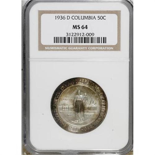 <B>1936-D 50C Columbia MS64 NGC.</B></I> NGC Census: (165/1226). PCGS Population (428/1291). Mintage: 8,009. Numismedia Wsl. Price for NGC/PCGS coin in MS64: $250. (#9292)<BR><BR><b>Shipping:</b> Coins & Currency (<a target="_blank" href="http://www.heritageauctions.com/common/shipping.php">view shipping information</a>)