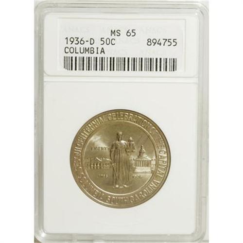<B>1936-D 50C Columbia MS65 ANACS.</B></I> NGC Census: (377/836). PCGS Population (608/669). Mintage: 8,009. Numismedia Wsl. Price for NGC/PCGS coin in MS65: $320. (#9292)<BR><BR><b>Shipping:</b> Coins & Currency (<a target="_blank" href="http://www.heritageauctions.com/common/shipping.php">view shipping information</a>\)
