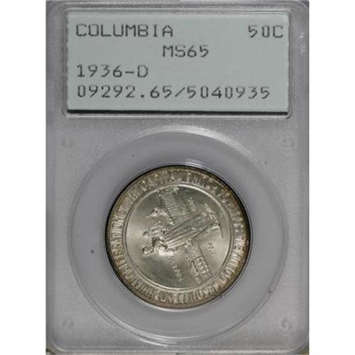 <B>1936-D 50C Columbia MS65 PCGS.</B></I> PCGS Population (616/674). NGC Census: (380/846). Mintage: 8,009. Numismedia Wsl. Price for NGC/PCGS coin in MS65: $320. (#9292)<BR><BR><b>Shipping:</b> Coins & Currency (<a target="_blank" href="http://www.heritageauctions.com/common/shipping.php">view shipping information</a>)