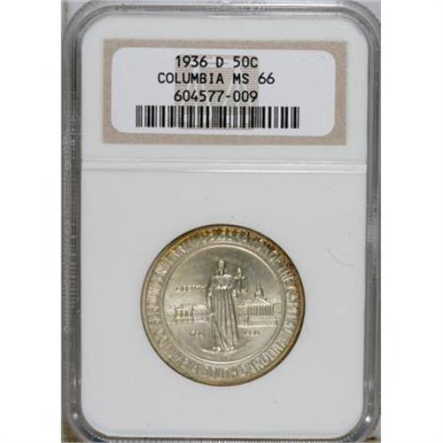<B>1936-D 50C Columbia MS66 NGC.</B></I> NGC Census: (605/230). PCGS Population (504/165). Mintage: 8,009. Numismedia Wsl. Price for NGC/PCGS coin in MS66: $440. (#9292)<BR><BR><b>Shipping:</b> Coins & Currency (<a target="_blank" href="http://www.heritageauctions.com/common/shipping.php">view shipping information</a>\)