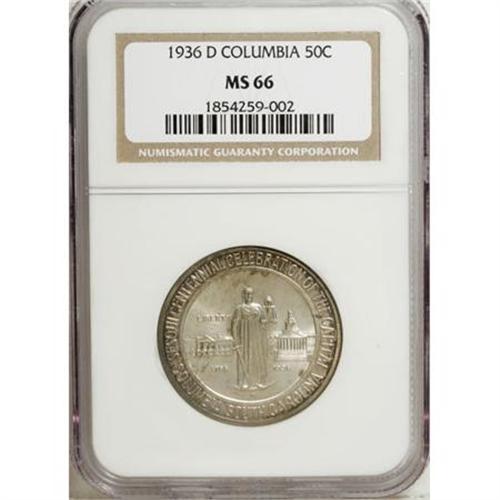 <B>1936-D 50C Columbia MS66 NGC.</B></I> NGC Census: (603/229). PCGS Population (501/165). Mintage: 8,009. Numismedia Wsl. Price for NGC/PCGS coin in MS66: $440. (#9292)<BR><I>From The Frank DuVall Collection of U.S. Commemoratives.</B></I><BR><BR><b>Shipping:</b> Coins & Currency (<a target="_blank" href="http://www.heritageauctions.com/common/shipping.php">view shipping information</a>\)
