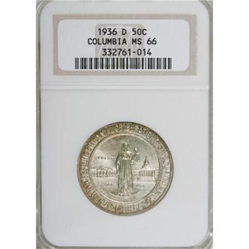 <B>1936-D 50C Columbia MS66 NGC.</B></I> NGC Census: (609/235). PCGS Population (506/165). Mintage: 8,009. Numismedia Wsl. Price for NGC/PCGS coin in MS66: $420. (#9292)<BR><BR><b>Shipping:</b> Coins & Currency (<a target="_blank" href="http://www.heritageauctions.com/common/shipping.php">view shipping information</a>)