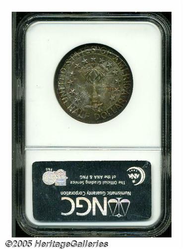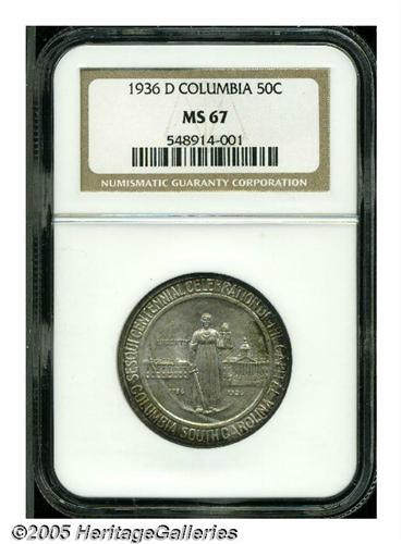 <B>1936-D<50C> Columbia MS67 NGC.</B></I> Exquisitely toned in rich fire-red, forest-green, peach, and cream-gray hues. The reverse is particularly colorful. A boldly struck and satiny Superb Gem, with gorgeously undisturbed fields.