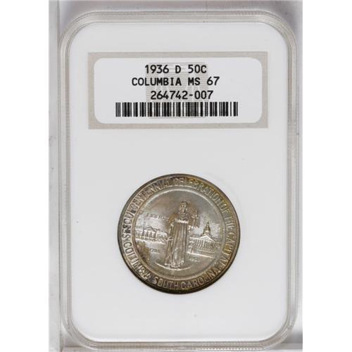 <B>1936-D<50C> Columbia MS67 NGC.</B></I> Quite lustrous and crisply struck, this Superb Gem has colorful toning on both sides. Russet peripheral toning frames a lavender center on the obverse, while the reverse has pastel blue, violet, and orange patina. Housed in a prior generation holder.
