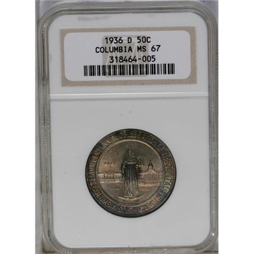 <B>1936-D<50C> Columbia MS67 NGC.</B></I> The tab-toned obverse features rich rose-red and aquamarine shades. The reverse is also impressively patinated peach and sea-green. This shimmering and immaculate Superb Gem is certified in an older NGC holder.