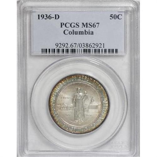 <B>1936-D 50C Columbia MS67 PCGS.</B></I> PCGS Population (150/15). NGC Census: (195/32). Mintage: 8,009. Numismedia Wsl. Price for NGC/PCGS coin in MS67: $900. (#9292)<BR><BR><b>Shipping:</b> Coins & Currency (<a target="_blank" href="http://www.heritageauctions.com/common/shipping.php">view shipping information</a>\)