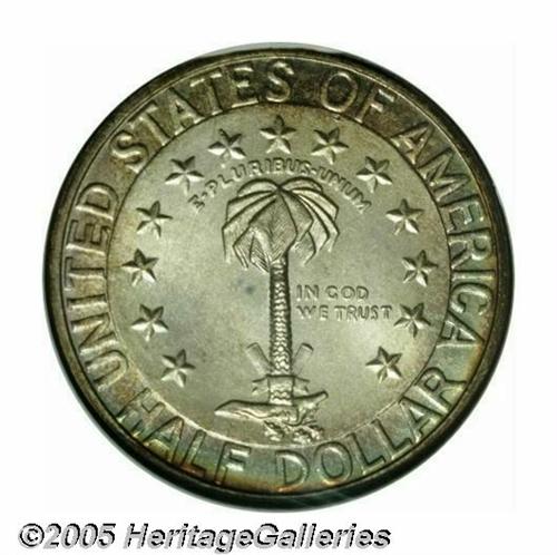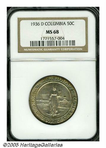 <B>1936-D<50C> Columbia MS68 NGC.</B></I> Honey and sky-blue hues endow the centers, while the margins feature pastel lime and golden-brown toning. A thorough examination is required to locate even unimportant contact on this lustrous and low mintage Silver Commemorative. Population: 25 in 68, 0 finer (4/05).