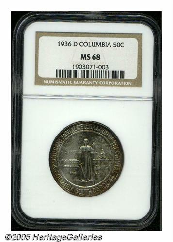 <B>1936-D<50C> Columbia MS68 NGC.</B></I> Toned with deep russet-gold at the periphery on the obverse, almost certainly from the original "tab" holders. Boldly struck throughout and highly appealing for this issue. The combined NGC and PCGS Population reports show 39 pieces graded this high with none seen finer by either service.