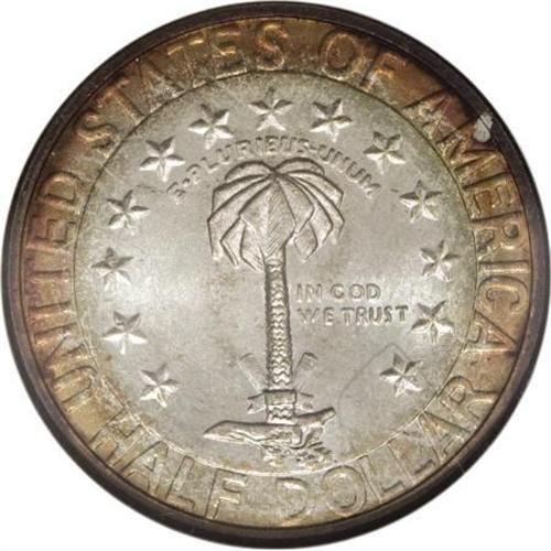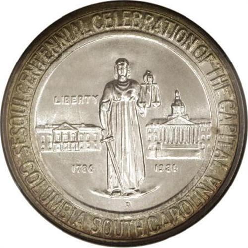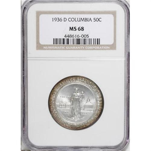 <B>1936-D 50C Columbia MS68 NGC.</B></I> Fully struck and seemingly pristine, with intense satin luster and beautiful peripheral toning on both sides. This issue had a limited mintage of 8,009 pieces, and only 49 of those have been certified at the MS68 grade level (and none finer), by NGC and PCGS combined (6/07), making this lovely example one of the finest known survivors. <BR><BR><b>Shipping:</b> Coins & Currency (<a target="_blank" href="http://www.heritageauctions.com/common/shipping.php">view shipping information</a>\)