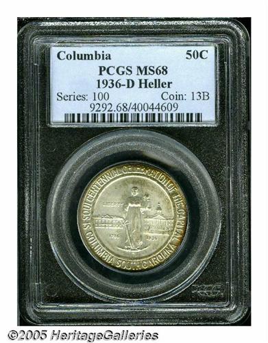 <B>1936-D<50C> Columbia MS68 PCGS.</B></I> Ex: Heller Collection. This is about as nice and original as they come. Soft-gray centers tone outward to subtle gold, russet, and crimson at the outer edges. The surfaces are virtually perfect as the grade would indicate. Population: 13 in 68, 0 finer (5/05).<BR><I>From The Western Hills Collection.</B></I>