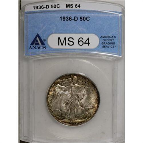 <B>1936-D 50C MS64 ANACS.</B></I> NGC Census: (480/661). PCGS Population (936/1305). Mintage: 4,252,400. Numismedia Wsl. Price for NGC/PCGS coin in MS64: $140. (#6599)<BR><BR><B>Coin Engraver:</B> Adolph A. Weinman<BR><BR><b>Shipping:</b> Coins & Currency (<a target="_blank" href="http://www.heritageauctions.com/common/shipping.php">view shipping information</a>)