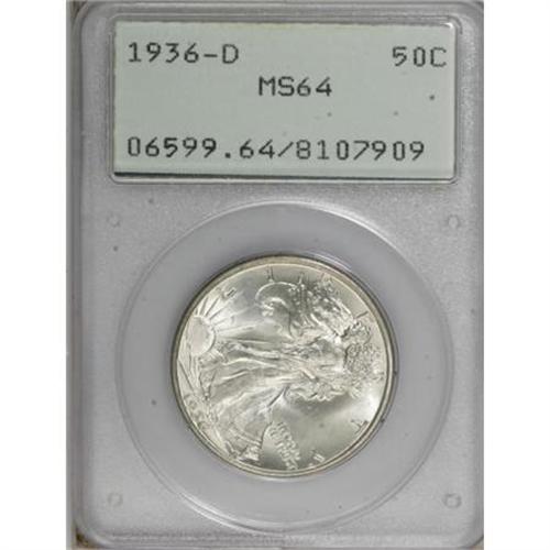 <B>1936-D 50C MS64 PCGS.</B></I> PCGS Population (918/1253). NGC Census: (464/655). Mintage: 4,252,400. Numismedia Wsl. Price for NGC/PCGS coin in MS64: $124. (#6599)<BR><BR><B>Coin Engraver:</B> Adolph A. Weinman<BR><BR><b>Shipping:</b> Coins & Currency (<a target="_blank" href="http://www.heritageauctions.com/common/shipping.php">view shipping information</a>)