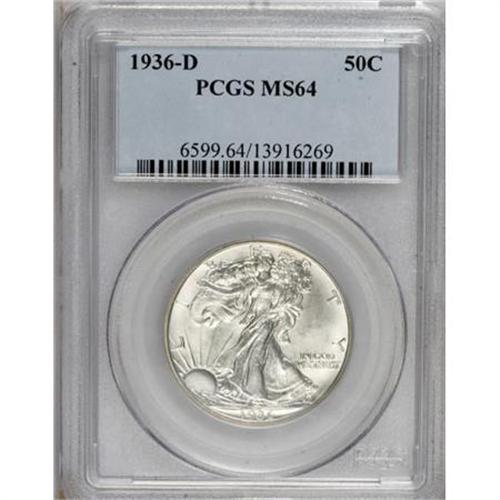 <B>1936-D 50C MS64 PCGS.</B></I> PCGS Population (927/1272). NGC Census: (466/656). Mintage: 4,252,400. Numismedia Wsl. Price for NGC/PCGS coin in MS64: $124. (#6599)<BR><BR><B>Coin Engraver:</B> Adolph A. Weinman<BR><BR><b>Shipping:</b> Coins & Currency (<a target="_blank" href="http://www.heritageauctions.com/common/shipping.php">view shipping information</a>)