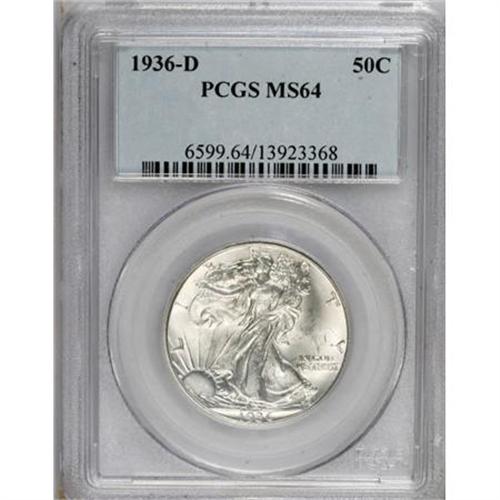 <B>1936-D 50C MS64 PCGS.</B></I> PCGS Population (927/1272). NGC Census: (466/656). Mintage: 4,252,400. Numismedia Wsl. Price for NGC/PCGS coin in MS64: $124. (#6599)<BR><BR><B>Coin Engraver:</B> Adolph A. Weinman<BR><BR><b>Shipping:</b> Coins & Currency (<a target="_blank" href="http://www.heritageauctions.com/common/shipping.php">view shipping information</a>)