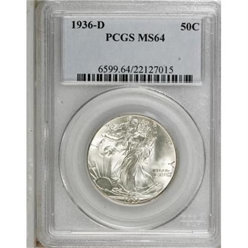 <B>1936-D 50C MS64 PCGS.</B></I> . PCGS Population (933/1295). NGC Census: (479/661). Mintage: 4,252,400. Numismedia Wsl. Price for NGC/PCGS coin in MS64: $140. (#6599)<BR><BR><B>Coin Engraver:</B> Adolph A. Weinman<BR><BR><b>Shipping:</b> Coins & Currency (<a target="_blank" href="http://www.heritageauctions.com/common/shipping.php">view shipping information</a>)