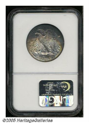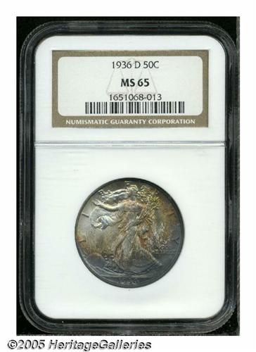 <B>1936-D<50C> MS65 NGC.</B></I> Variegated charcoal-gray, reddish-gold, golden-brown, and crimson patination bathes lustrous surfaces over each side. The design features are adequately struck, and there are no significant contact marks.