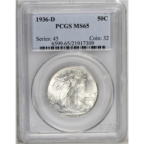 <B>1936-D 50C MS65 PCGS.</B></I> This example is typical of most high quality pieces with frosty silver luster and no toning. A tiny mark in the obverse field limits the grade, and the strike is average for the date.<BR><BR><b>Shipping:</b> Coin/Currency (<a target="_blank" href="http://www.heritageauctions.com/common/shipping.php">view shipping information</a>)