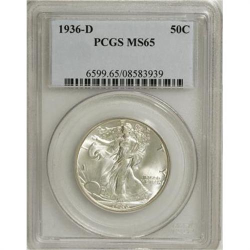 <B>1936-D 50C MS65 PCGS.</B></I> PCGS Population (908/348). NGC Census: (484/172). Mintage: 4,252,400. Numismedia Wsl. Price for NGC/PCGS coin in MS65: $530. (#6599)<BR><BR><B>Coin Engraver:</B> Adolph A. Weinman<BR><BR><b>Shipping:</b> Coins & Currency (<a target="_blank" href="http://www.heritageauctions.com/common/shipping.php">view shipping information</a>)