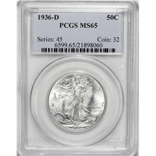 <B>1936-D 50C MS65 PCGS.</B></I> PCGS Population (908/348). NGC Census: (484/172). Mintage: 4,252,400. Numismedia Wsl. Price for NGC/PCGS coin in MS65: $530. (#6599)<BR><BR><B>Coin Engraver:</B> Adolph A. Weinman<BR><BR><b>Shipping:</b> Coins & Currency (<a target="_blank" href="http://www.heritageauctions.com/common/shipping.php">view shipping information</a>)