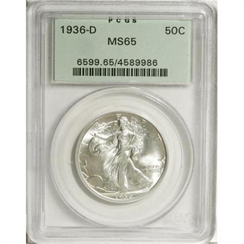 <B>1936-D 50C MS65 PCGS.</B></I> A splendid Gem in an older green-label holder, with fully brilliant surfaces and frosty luster. Sharply struck with a full thumb. Slight doubling is apparent inside the mintmark.<BR><BR><B>Coin Engraver:</B> Adolph A. Weinman<BR><BR><b>Shipping:</b> Coins & Currency (<a target="_blank" href="http://www.heritageauctions.com/common/shipping.php">view shipping information</a>)