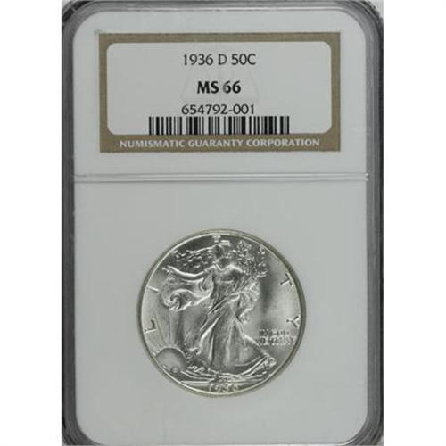 <B>1936-D 50C MS66 NGC.</B></I> Though Liberty's hands show only slight definition, the eagle is uncommonly bold on this shining Premium Gem. A carefully preserved and minimally toned beauty. NGC has graded just 23 numerically finer pieces (3/08).<BR><BR><B>Coin Engraver:</B> Adolph A. Weinman<BR><BR><b>Shipping:</b> Coins & Currency (<a target="_blank" href="http://www.heritageauctions.com/common/shipping.php">view shipping information</a>)