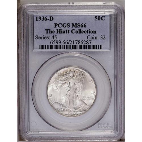 <B>1936-D<50C> MS66 PCGS.</B></I> Ex: Hiatt Collection. An instantly appealing Premium Gem that is virtually untoned with creamy surfaces that display just a few trivial marks. The design features are adequately brought up. Only 18 specimens have been graded higher by PCGS (3/06). <BR><BR><B>Important notice:</B> Heritage usually auctions material at the rate of 200-250 lots per hour. On some occasions eBay Live bid software or the Internet may not be able to keep up with the pace of the auction. We recommend placing a realistic absentee bid now as insurance to avoid disappointment. Occasionally the auctioneer may eliminate or reject an eBay Live bid, and the auctioneer may also reopen a lot after the close of the eBay live bidding (usually because we missed an audience bid), and may reject your bid even if it shows you as the winning bidder. By bidding via eBay Live, you agree that Heritage may award the lot to another bidder at its sole discretion under the circumstances described above or any other reasonable circumstances. Since eBay bids are not shown to us until we open the lot on the floor, we treat those bids just like floor bids. In most cases the floor responds before the eBay bid is presented to us, due to Internet lag time, so for consistency we have made it a policy that floor bids are always considered first over tie eBay live bids. Also please note that all Heritage lots purchased through eBay Live carry a 20% Buyer's Premium. Please make sure you read the Terms and Conditions before you bid. This lot is being auctioned in conjunction with a live floor auction by Heritage Galleries & Auctioneers. All final auction and invoice information will be supplied by Heritage Galleries & Auctioneers, and all other information should be considered preliminary. Lot:2956 <BR><BR><B>Winning Notification and Billing:</B> After the FINAL session in this auction is complete, Heritage will send e-mail and snail mail invoices. This process normally takes several days. All final auction and invoice information will be supplied by Heritage Galleries & Auctioneers, and all other information should be considered preliminary. <BR><BR>This auction will be conducted on a live auction floor and over the Internet through eBay Live. If you choose to place an absentee bid, please take a moment to <font color='#0000ff'><u><a href='http://pages.ebay.com/liveauctions/help/before/laabsentee.html'>learn how eBay Live absentee bidding works</a></u></font><font color='#000000'>