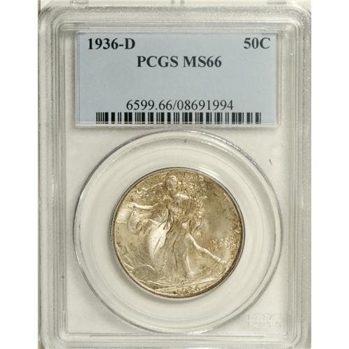 <B>1936-D 50C MS66 PCGS.</B></I> Speckles of olive-green and russet dot lustrous surfaces on this lovely Premium Gem Walker. Well preserved and powerfully struck, including bold detail on Liberty's gown lines and left thumb.<BR><BR><b>Shipping:</b> Coins & Currency (<a target="_blank" href="http://www.heritageauctions.com/common/shipping.php">view shipping information</a>)