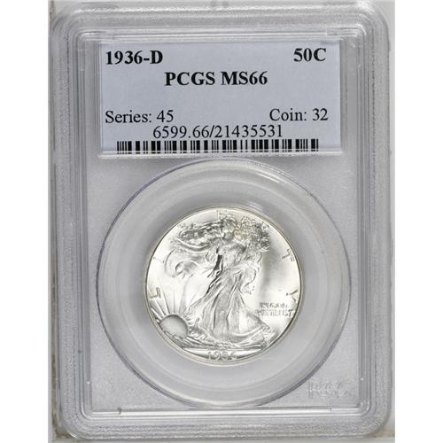 <B>1936-D 50C MS66 PCGS.</B></I> The thumb on Liberty's branch hand has some definition. A highly lustrous, brilliant piece that has a thin abrasion on the eagle's breast.<BR><BR><b>Shipping:</b> Coin/Currency (<a target="_blank" href="http://www.heritageauctions.com/common/shipping.php">view shipping information</a>)