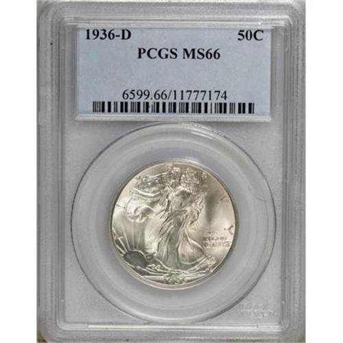 <B>1936-D 50C MS66 PCGS.</B></I> PCGS Population (329/19). NGC Census: (150/22). Mintage: 4,252,400. Numismedia Wsl. Price for NGC/PCGS coin in MS66: $1,375. (#6599)<BR><BR><B>Coin Engraver:</B> Adolph A. Weinman<BR><BR><b>Shipping:</b> Coins & Currency (<a target="_blank" href="http://www.heritageauctions.com/common/shipping.php">view shipping information</a>)