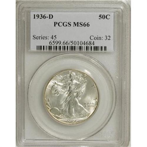 <B>1936-D 50C MS66 PCGS.</B></I> PCGS Population (329/19). NGC Census: (150/22). Mintage: 4,252,400. Numismedia Wsl. Price for NGC/PCGS coin in MS66: $1,375. (#6599)<BR><BR><B>Coin Engraver:</B> Adolph A. Weinman<BR><BR><b>Shipping:</b> Coins & Currency (<a target="_blank" href="http://www.heritageauctions.com/common/shipping.php">view shipping information</a>)