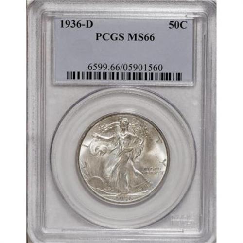 <B>1936-D 50C MS66 PCGS.</B></I> A pleasingly detailed Premium Gem, slightly satiny beneath gold-inflected silver-blue patina. Though a small mark is noted on the sun, the coin is beautifully preserved. PCGS has graded 19 finer examples (11/07).<BR><BR><B>Coin Engraver:</B> Adolph A. Weinman<BR><BR><b>Shipping:</b> Coins & Currency (<a target="_blank" href="http://www.heritageauctions.com/common/shipping.php">view shipping information</a>)