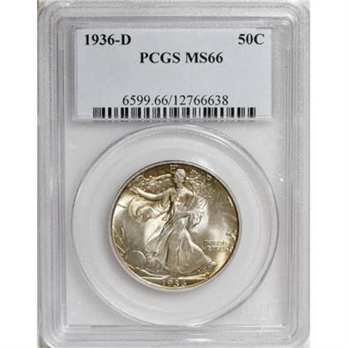 <B>1936-D 50C MS66 PCGS.</B></I> Strong, swirling luster with a hint of flash characterizes this slightly satiny Premium Gem. Both sides show silver-green patina at the centers, and while the obverse shows gold-orange at the margins, the reverse periphery shows only a few vestiges of such color.<BR><BR><B>Coin Engraver:</B> Adolph A. Weinman<BR><BR><b>Shipping:</b> Coins & Currency (<a target="_blank" href="http://www.heritageauctions.com/common/shipping.php">view shipping information</a>)