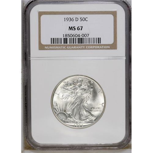 <B>1936-D 50C MS67 NGC.</B></I> Bruce Fox (1993) writes of the 1936-D: "Finding the combination of full strike, minimal surfaces abrasions and superior eye appeal can be difficult." That is what makes this specimen so special: it displays bright frosty luster, exquisitely struck design elements (Liberty's left hand and the adjacent branches, for example, illustrate complete delineation), and impeccably preserved surfaces. Just a few luster grazes on the Liberty motif and in the right obverse field, and a couple of small milling marks on the eagle, do not in any way deny the Superb Gem designation. Census: 17 in 67, 0 finer at either service (10/06).<BR><BR><b>Shipping:</b> Coin/Currency (<a target="_blank" href="http://www.heritageauctions.com/common/shipping.php">view shipping information</a>)