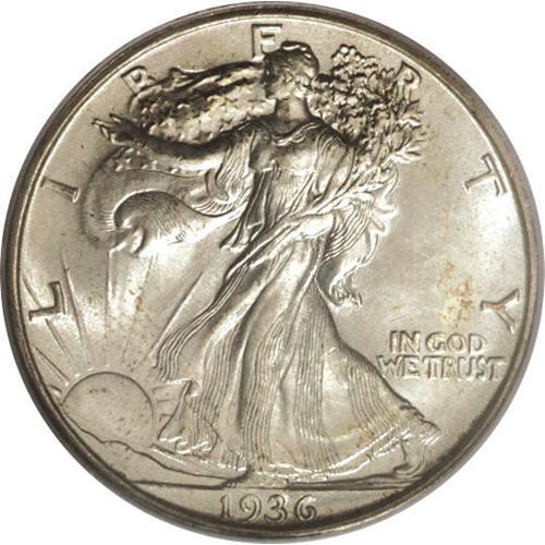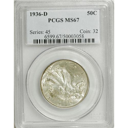 <B>1936-D 50C MS67 PCGS.</B></I> Light olive-gold toning enriches the lustrous and decisively struck surfaces. The reverse appears immaculate, and the obverse has only subtle contact near the branch stem and motto. The 1936-D is located with little difficulty in typical Mint State grades, but is undeniably rare as a Superb Gem. Population: 19 in 67, 0 finer (1/07).<BR><BR><b>Shipping:</b> Coins & Currency (<a target="_blank" href="http://www.heritageauctions.com/common/shipping.php">view shipping information</a>)