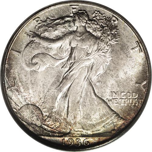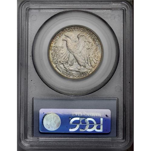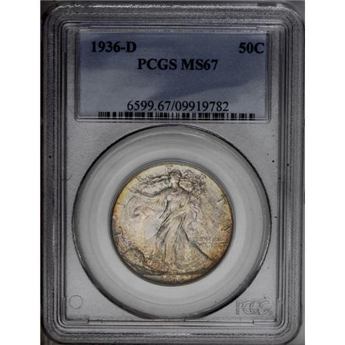 <B>1936-D<50C> MS67 PCGS.</B></I> Originality and strength of detail carry the day on this Superb, frosty Gem. The obverse boasts a crescent of speckled orange and magenta toning while lighter peripheral color accents the reverse as well. A great find for the quality conscious Walking Liberty collector. Population: 18 in 67, 0 finer (3/06). <BR><BR><B>Important notice:</B> Heritage usually auctions material at the rate of 200-250 lots per hour. On some occasions eBay Live bid software or the Internet may not be able to keep up with the pace of the auction. We recommend placing a realistic absentee bid now as insurance to avoid disappointment. Occasionally the auctioneer may eliminate or reject an eBay Live bid, and the auctioneer may also reopen a lot after the close of the eBay live bidding (usually because we missed an audience bid), and may reject your bid even if it shows you as the winning bidder. By bidding via eBay Live, you agree that Heritage may award the lot to another bidder at its sole discretion under the circumstances described above or any other reasonable circumstances. Since eBay bids are not shown to us until we open the lot on the floor, we treat those bids just like floor bids. In most cases the floor responds before the eBay bid is presented to us, due to Internet lag time, so for consistency we have made it a policy that floor bids are always considered first over tie eBay live bids. Also please note that all Heritage lots purchased through eBay Live carry a 20% Buyer's Premium. Please make sure you read the Terms and Conditions before you bid. This lot is being auctioned in conjunction with a live floor auction by Heritage Galleries & Auctioneers. All final auction and invoice information will be supplied by Heritage Galleries & Auctioneers, and all other information should be considered preliminary. Lot:2958 <BR><BR><B>Winning Notification and Billing:</B> After the FINAL session in this auction is complete, Heritage will send e-mail and snail mail invoices. This process normally takes several days. All final auction and invoice information will be supplied by Heritage Galleries & Auctioneers, and all other information should be considered preliminary. <BR><BR>This auction will be conducted on a live auction floor and over the Internet through eBay Live. If you choose to place an absentee bid, please take a moment to <font color='#0000ff'><u><a href='http://pages.ebay.com/liveauctions/help/before/laabsentee.html'>learn how eBay Live absentee bidding works</a></u></font><font color='#000000'>