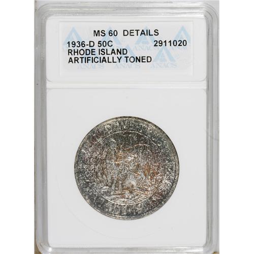 <B>1936-D 50C Rhode Island--Artificially Toned--ANACS. MS60 Details.</B></I> NGC Census: (0/1485). PCGS Population (3/2483). Mintage: 15,010. Numismedia Wsl. Price: $87. (#9364)<BR><BR><b>Shipping:</b> Coins & Currency (<a target="_blank" href="http://www.heritageauctions.com/common/shipping.php">view shipping information</a>)